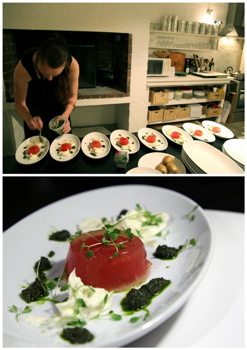 Putting some micro herbs on the third course: “24 hour tomato terrine”. A view of the menu. (Pictures: Anelia Loubser)