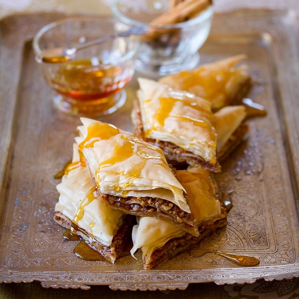 Baklava is such a classic Greek delicacy, although you would also find fabulous baklava all over the Mediterranean and Middle East, especially in Turkey (where baklava has it’s origins). Traditionally, Greek baklava is made with 33 layers of filo pastry, but any commercial 500g packet of filo will suffice. In this recipe, I used crushed walnuts and almonds, but you can use almost any nuts of your preference. Pistachios also work very well, and the green specs look spectacular. The syrup is infused with cloves, cinnamon and lemon rind – such a fragrant addition to the richness of the nuts and the pastry.