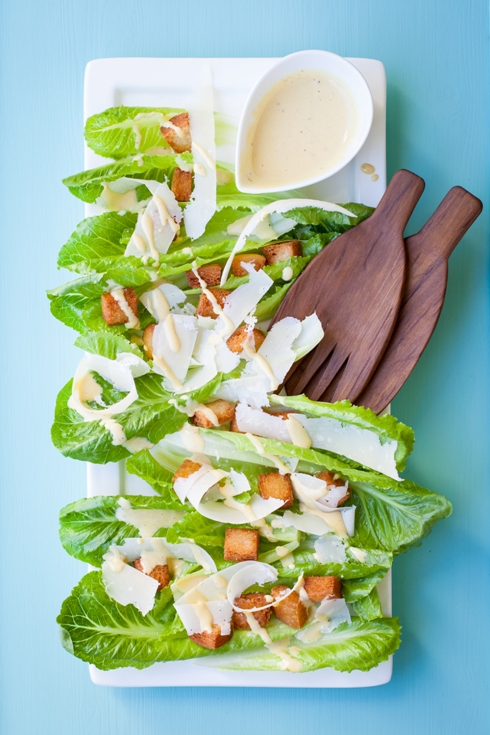 - On a large flat platter, arrange washed cos lettuce leaves (I always give them a spin in my salad spinner to get rid of excess water, but you can also just drain the water with a clean tea towel). Top with shaved parmigiano reggiano and croutons, then drizzle with dressing. Serve immediately with extra dressing on the side.