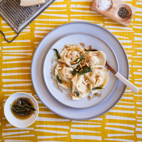 Working quickly, drizzle each portion of cooked ravioli with sage butter, and top with a few toasted pine nuts. Serve at once – freshly cooked pasta is always best served immediately!