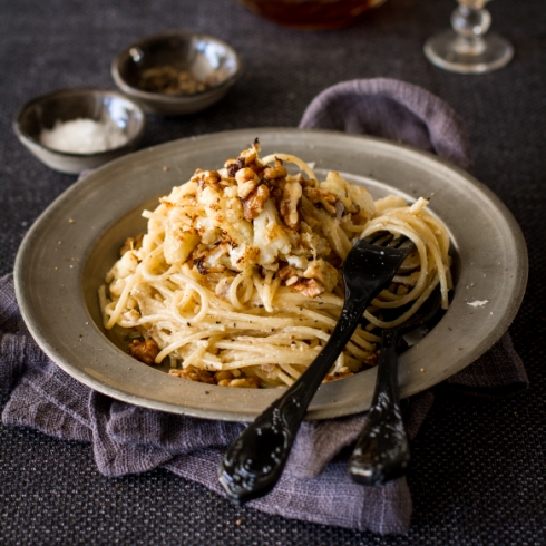 The trick is to cut the cauliflower into very small florets – about the size of your thumb, or smaller. I sprinkle the pieces with finely grated parmesan cheese, then roast them in a 200 C oven for about 15 minutes until they start to turn golden brown on the edges – it creates an amazing nutty flavour. I then blend half of the roasted florets to a smooth pulp with stock, and mix it with cream and blue cheese. Mix this sauce through the cooked spaghetti, then serve it topped with more roasted cauliflower en toasted walnuts.
