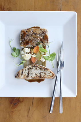 Cuvée is known for their “quirky mix of nostalgia and Cape Dutch modernism”. All items on the one-page menu are seasonally inspired, and the decor is unpretentious and inviting. After ordering a glass of Simonsig’s famous Kaapse Vonkel Brut, we ordered our starters: Oysters with caviar, pickled cucumber, sai sai & kimchi for me, and rabbit terrine with bourbon pickled vegetables & grilled sourdough for Schalk. Our starters were both magnificent – the oysters were impeccably fresh, the flavours so bright yet not overpowering. The rabbit terrine surprised us with great flavour and wonderfully diverse textures, especially the pickled vegetables. On recommendation, Schalk enjoyed a glass of Simonsig Adelberg Sauvignon Blanc with his starter – a perfect match.