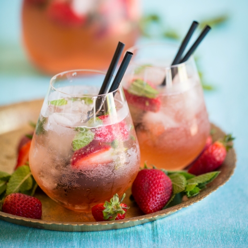 Summery red muscadel cocktails with soda water, strawberries, and fresh mint (photography by Tasha Seccombe)