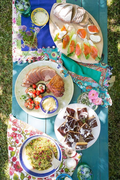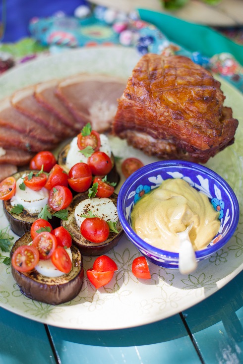 My choices for the perfect Christmas picnic table comes from The Picnic Cookbook by Annie Bell (R285 from Poetry Stores). Annie’s recipes are simple but scrumptious, and her book is a great choice for any al fresco feast. The maple roast ham is glazed with a beautifully dark mixture of black treacle, maple syrup and English mustard – easy to make ahead and simply delicious served cold or at room temperature. I’ve also chosen Annie’s recipe for gravadlax, a wonderful alternative to cold smoked fish. I used locally farmed trout instead of salmon for the gravadlax – use what you prefer and what you can afford. For a salad I chose Annie’s couscous salad with pistachios and pomegranate – one of the most beautiful salads to look at with bright green and red specs! I also made her aubergine veggie roast with goat’s cheese and tomatoes.