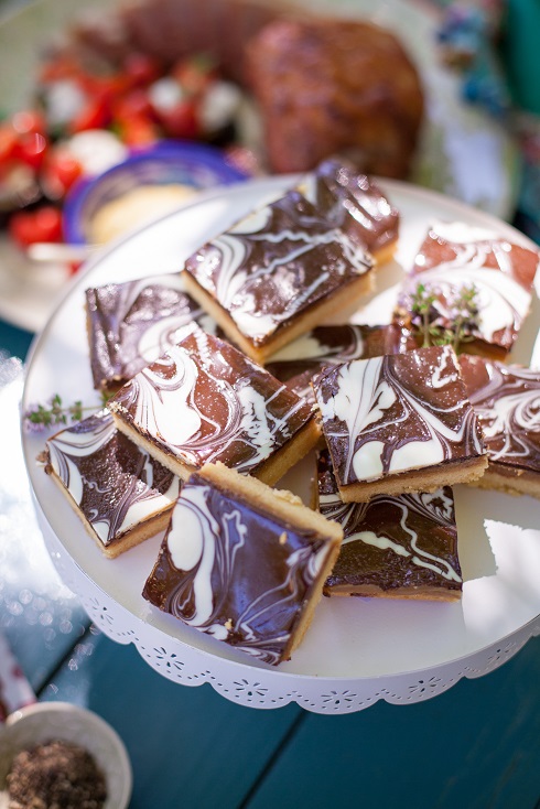 - Melt the chocolate in a bowl set over a pan of simmering water, then pour over the caramel and smooth the top. If you want to marble the surface, melt the white chocolate in the same way, then drop 1/4 teaspoons on top of the dark, marbling it with a cocktail stick. Work quickly.