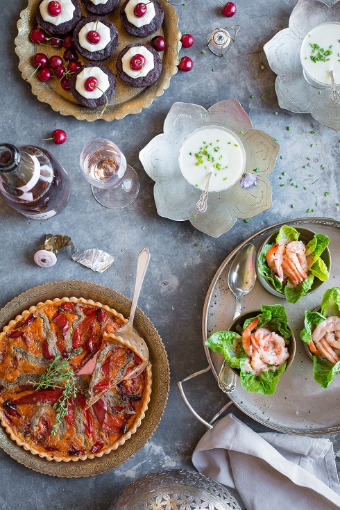 I have chosen a selection of cold cocktail snacks, including vichyssoise (a traditional French cold potato & leek soup), old-fashioned prawn cocktail with Marie Rose sauce, roasted pepper and tomato tart with anchovies, and dark chocolate cupcakes with cream cheese icing. All of these go well with a glass of bubbly, so don’t be shy to drink while you snack!