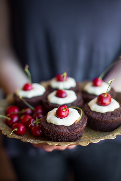 Chocolate and apple sauce cupcakes with cream cheese frosting and fresh cherries (photography by Tasha Seccombe)